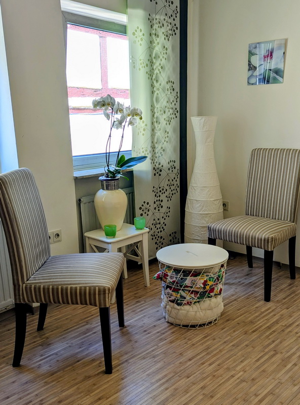 Der helle, freundliche Praxisraum ist kühl in den Sommermonaten.